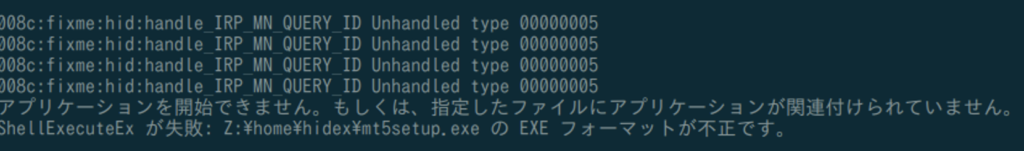 ShellExecuteEx が失敗: Z:\home\hidex\mt5setup.exe の EXE フォーマットが不正です。