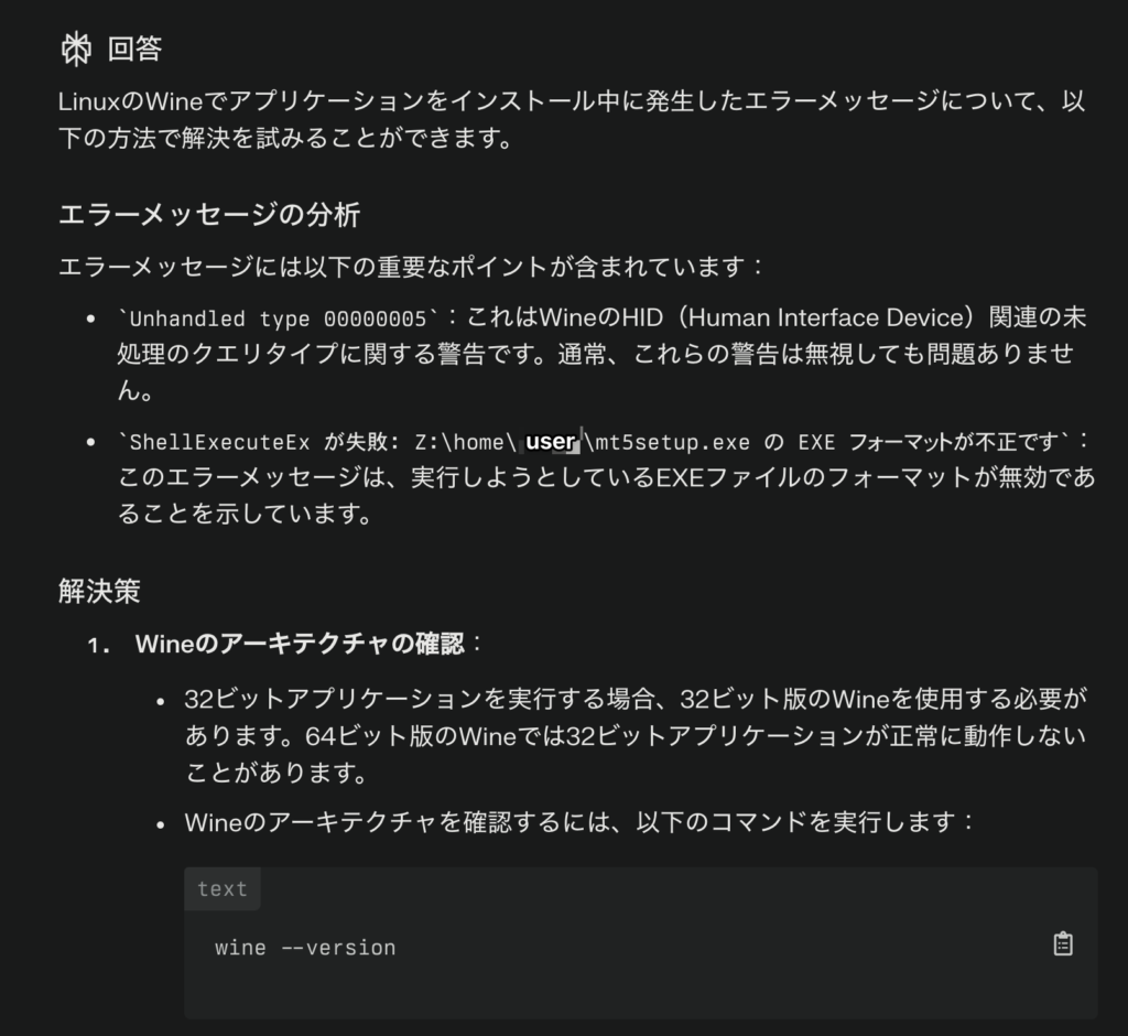 ShellExecuteEx が失敗: Z:\home\user\mt5setup.exe の EXE フォーマットが不正です。